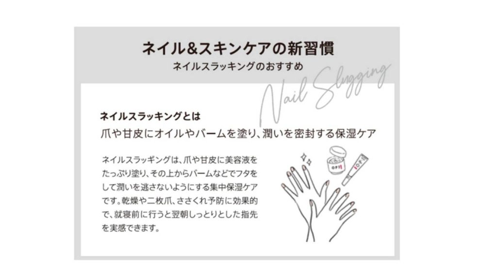 お顔のスキンケアで人気の「スラッキング」を、爪版にしたものです。